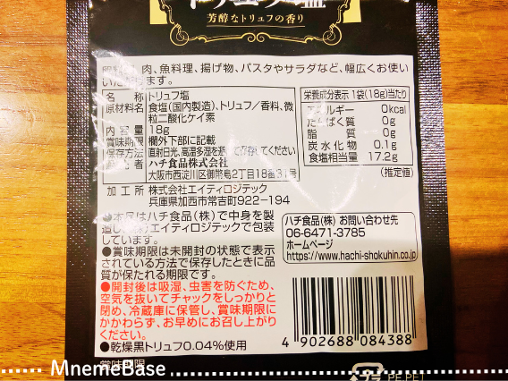 | Hachiトリュフ塩 | 18g | 食塩(国内製造)、トリュフ、香料、微粒二酸化ケイ素 | 110円 | 可 |